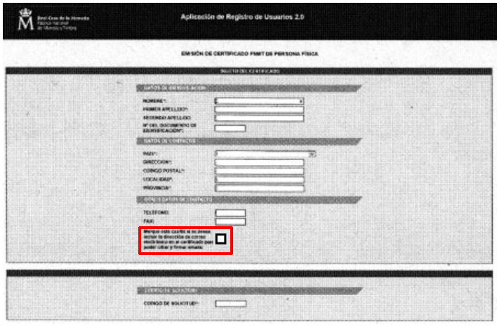 Dentro de la oficina del registro, el registrador (persona funcionario que atiende al ciudadano) me ha pido una acreditación de mi personalidad (que puede ser el DNI), y el "Código de solicitud" de 9 dígitos, el registrador verifica los datos del formulario de "acreditación de emisión de certificado FNMT de persona física", en ella esta puesto los "datos del interesado y su domicilio que figura el en censo del Ayuntamiento" él registrador tiene que rellenar el campo del "Código de solicitud", pero hay un campo o casilla (cuadrado pequeño) que dice "MARQUESE ESTA CASILLA SI SE DESEAN INCLUIR LA DIRECCIÓN DE CORREO ELECTRÓNICO EN EL CERTIFICADO PARA PODER CIFRAR Y FIRMAR EMAIS" [ver imagen 3] esta casilla □ por defecto el registrador no la suele marcar y el ciudadano no la suele pedir.