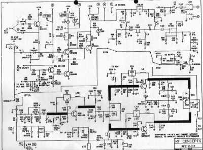 Ya saqué el esquema. Es prácticamente igual al del RFC-217 con algunas diferencias menores. No se si serán los mismos transistores porque en el L200A tienen el nombre borrado (esmerilado y tintado). El L200A no tiene el transistor para PTT exterior ni una linea coaxial que aparece en paralelo con el conector ANT en el RFC (¿filtro pasa banda o notch?). Al menos aparece en el esquema. Sería interesante ver qué hay en una foto.