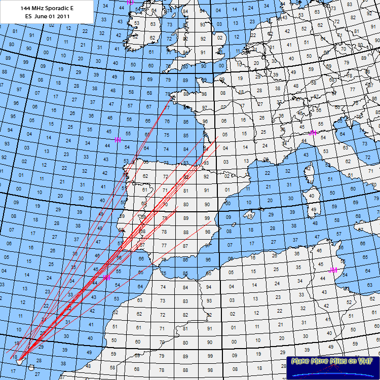 Es decir, la MUF parecía estar demasiado baja como para permitir semejante apertura en 144 MHz, lo cual podría apuntar a tropo. Pero para tropo, precisamente eché en falta los contactos entre EA8 y la zona de Cadiz-Huelva-Sevilla que tan fácilmente se dan cuando hay condiciones.