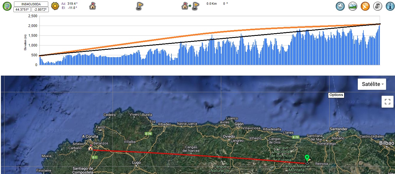 La trayectoria EA1UR - EA1IT era mejor, por tener el ángulo menor de 1º en horizonte... esto en 144 no falla... en 432 se hizo el QSO, ya dá una idea de éxito... peroooo ahí tienes los 1200 que se resistieron "a plegarse"...., y no es la primera vez que observo esto. (puñeteras microondas... 😜 ). La atenuación nos pudo.