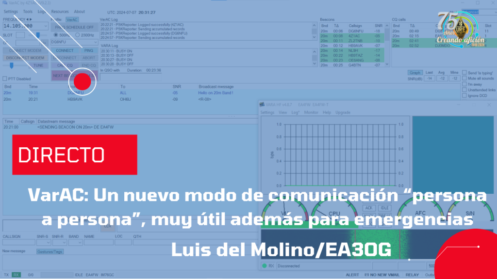 Luis en esta charla nos explicará porqué la nueva modalidad digital VarAC para comunicaciones digitales teclado a teclado, basada en el modem VARA, y que fue diseñado en principio para acceder a la red Winlink por José Alberto Nieto Ros (EA5HVK), al incluir la nueva interface de usuario de Irad Deutsch (4Z1AC) se está imponiendo en todo el mundo como nuevo modo de comunicación “teclado a teclado”, siendo además muy útil para las comunicaciones de emergencia EmComm.
