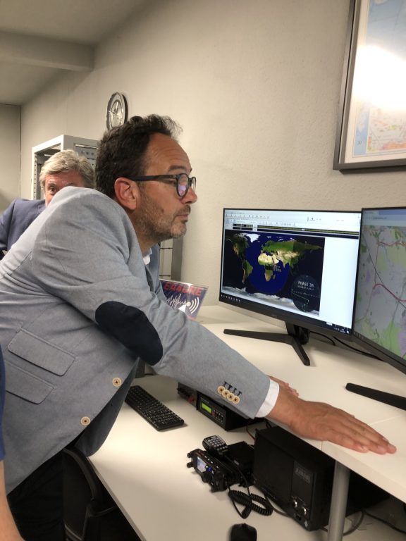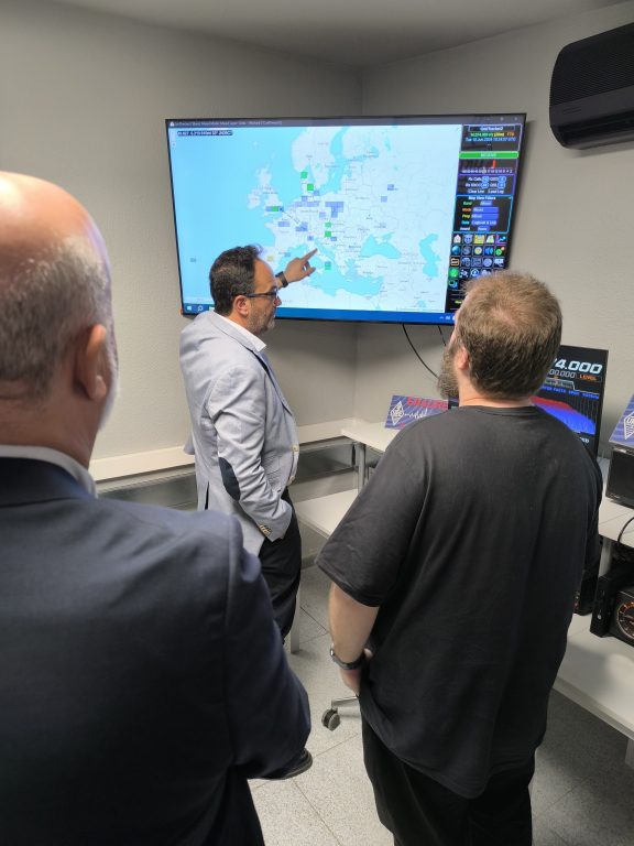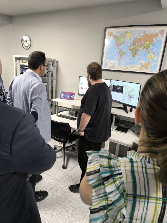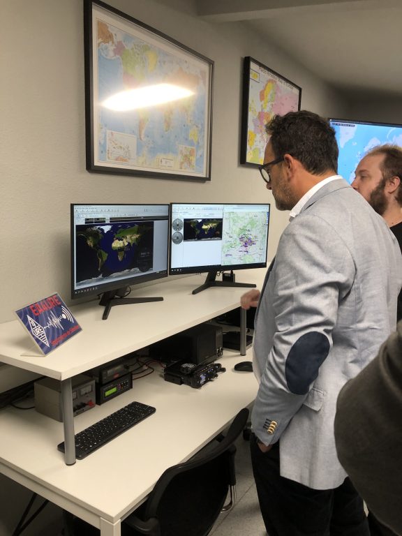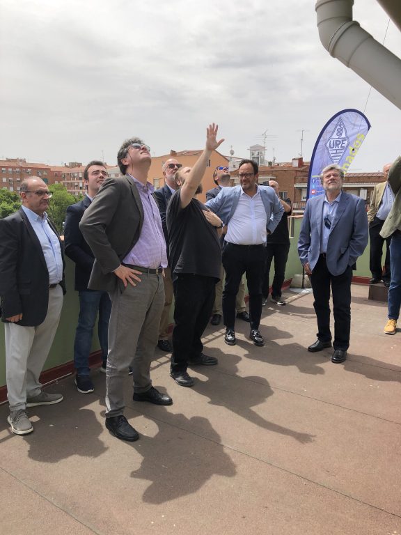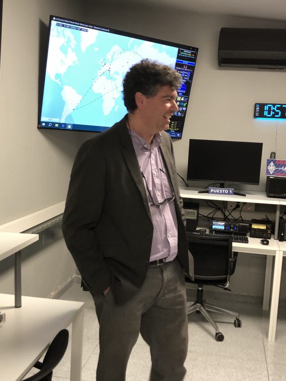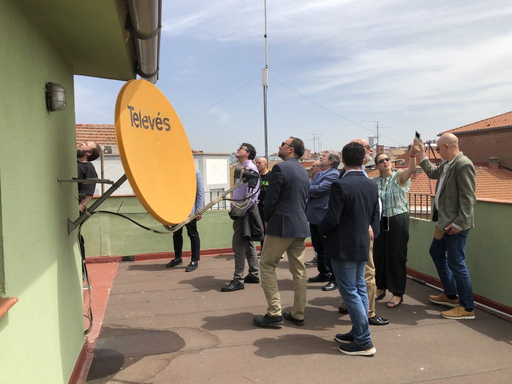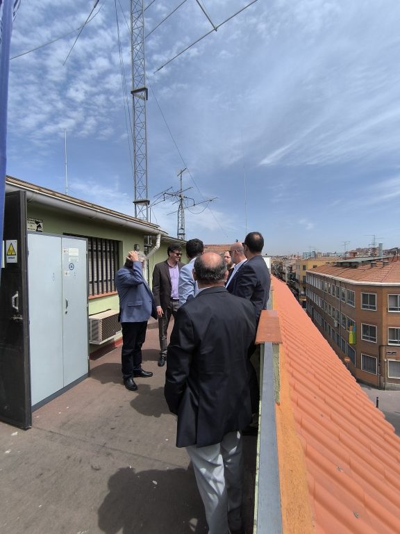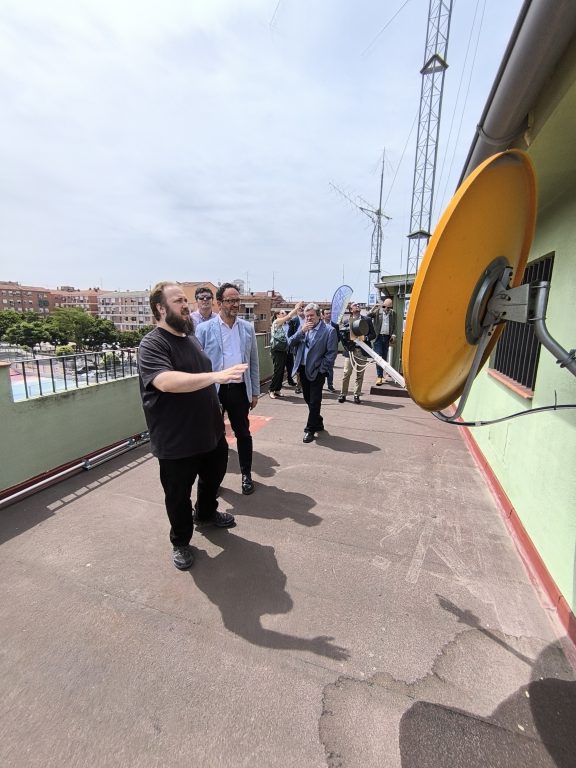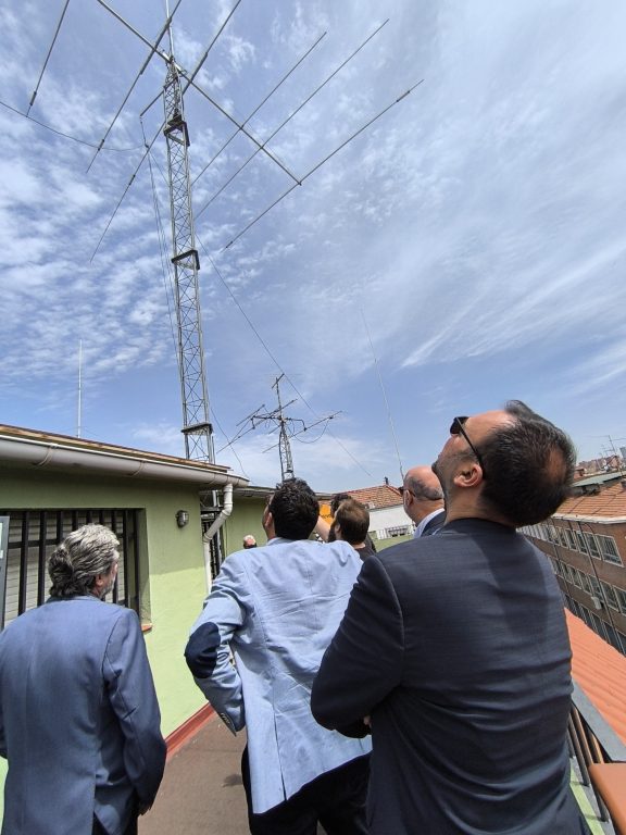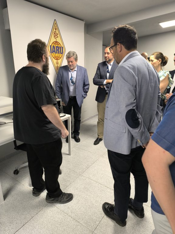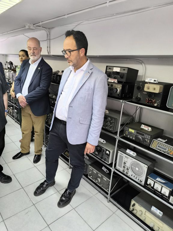 Uno de los momentos más destacados fue la subida a la tercera planta, donde se encuentran la estación de radio EA4URE y la instalación de antenas. Allí se realizó una demostración práctica de los equipos —algunos cedidos por Icom y Proyecto4, a quienes expresamos nuestro agradecimiento—, dirigida por el equipo técnico de la Sección de URE Madrid. Los responsables institucionales mostraron un especial interés por el potencial tecnológico y formativo de estas instalaciones.