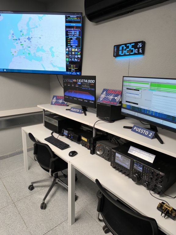 En la segunda planta, los invitados asistieron a una charla explicativa en la sala multiusos sobre las funciones, estructura y objetivos de la URE. La presentación, a cargo de EA5ME y EA1JAY, puso de relieve la importancia de la radioafición como herramienta educativa, científica y de servicio en situaciones de emergencia. Esta intervención fue apoyada por una completa presentación visual que ilustró el alcance de la actividad radioaficionada a nivel nacional e internacional.